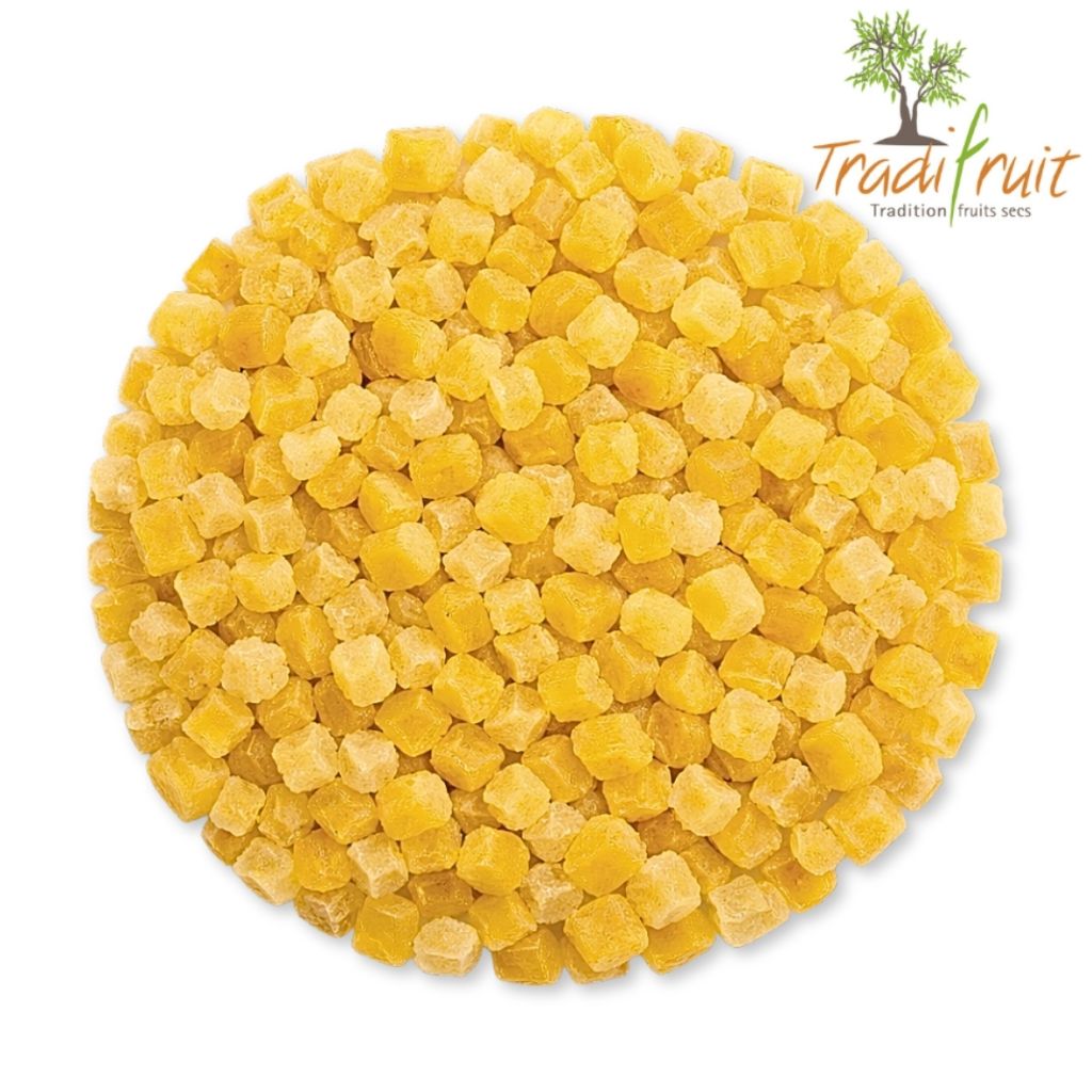 Description du produit : Cubes d’écorce d’orange 6×6 mm, découpés avec précision pour une taille régulière et homogène. Saveur intense et parfumée, apportant une note d’agrume fraîche et légèrement amère. Idéals pour la pâtisserie, la chocolaterie, les brioches, cakes et préparations professionnelles.