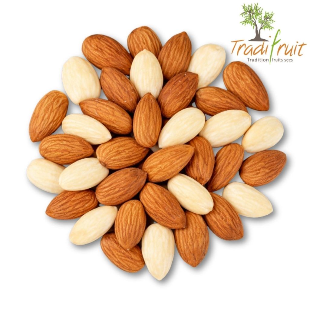 Description du produit : Amandes fraichement décortiquées, variété Valencia. 100% fruit de l’amandier sans additifs ni conservateurs.